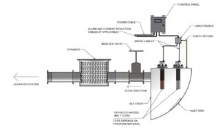 Systems on frigates usually involve a combination of seachest and strainer-mounted anodes. As with most military vessels, the pipework is predominantly cupro-nickel and therefore pairs of copper and ferrous anodes are used to provide effective anti-fouling and corrosion suppression.